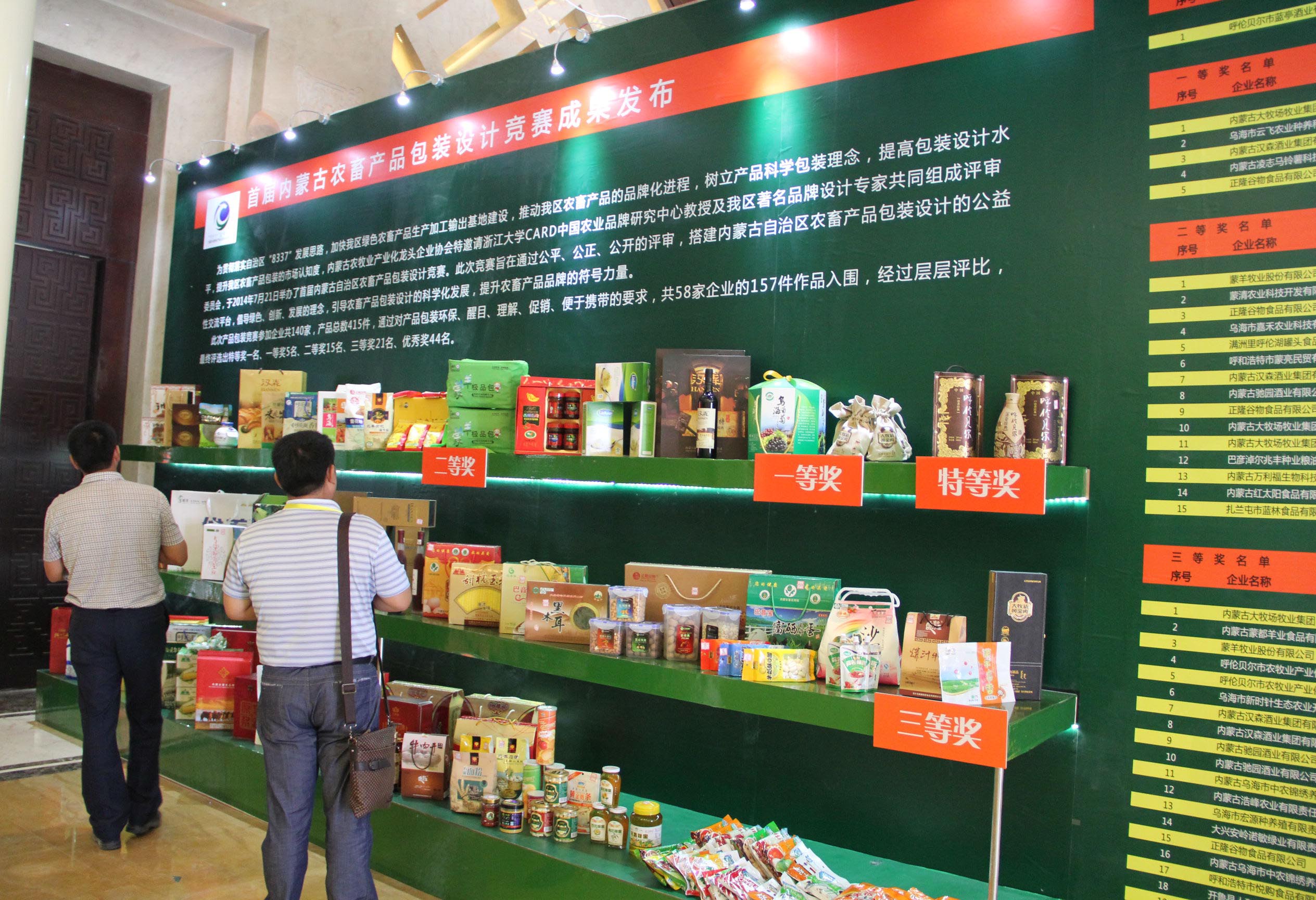 本次綠博會(huì)的最大亮點(diǎn)在于由農(nóng)牧業(yè)廳授權(quán),在中國(guó)·內(nèi)蒙古綠色農(nóng)畜產(chǎn)品博覽會(huì)組委會(huì)的大力支持下,協(xié)會(huì)認(rèn)定的2014(第二屆)內(nèi)蒙古“名優(yōu)特”農(nóng)畜產(chǎn)品名單和首屆內(nèi)蒙古農(nóng)畜產(chǎn)品包裝設(shè)計(jì)競(jìng)賽獲獎(jiǎng)產(chǎn)品在綠博會(huì)上展出。此次共有76家企業(yè)生產(chǎn)的143個(gè)產(chǎn)品被認(rèn)定為內(nèi)蒙古“名優(yōu)特”產(chǎn)品,共有86件產(chǎn)品在包裝設(shè)計(jì)大賽中獲獎(jiǎng),其中特等獎(jiǎng)1名、一等獎(jiǎng)5名、二等獎(jiǎng)15名、三等獎(jiǎng)21名、優(yōu)秀獎(jiǎng)44名。