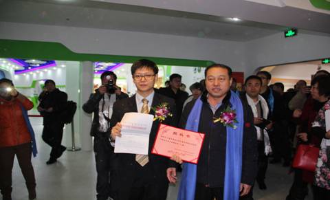 內(nèi)蒙古農(nóng)牧業(yè)產(chǎn)業(yè)化龍頭企業(yè)協(xié)會執(zhí)行會長林永亮為上海精品館館長杜勇頒發(fā)授權(quán)書