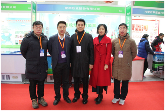 中國農業(yè)產業(yè)化龍頭企業(yè)協(xié)會副秘書長李現(xiàn)洲(中)與協(xié)會會長閆樹春、常務秘書長劉俊青在蒙羊牧業(yè)展位前合影
