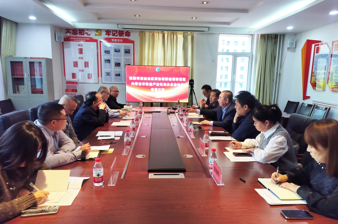 2024年12月18日下午,自治區政協(xié)委員、港澳臺僑聯(lián)絡(luò )和外事委員會(huì )主任張波,內蒙古工業(yè)大學(xué)僑聯(lián)副主席新巴雅爾,內蒙古航空職業(yè)技術(shù)學(xué)校校長(cháng)、內蒙古航空運動(dòng)協(xié)會(huì )會(huì )長(cháng)趙自強,自治區政協(xié)港澳臺僑聯(lián)絡(luò )和外事委員會(huì )辦公室主任安勝利一行6人來(lái)協(xié)會(huì )調研指導工作,協(xié)會(huì )副會(huì )長(cháng)單位內蒙古凌志馬鈴薯科技股份有限公司總經(jīng)理閆洪志、內蒙古民豐種業(yè)有限公司劉榮書(shū),常務(wù)理事單位內蒙古額爾敦羊業(yè)股分有限公司董事長(cháng)助理畢欣及協(xié)會(huì )秘書(shū)處全體工作人員參加會(huì )議,會(huì )議由協(xié)會(huì )秘書(shū)長(cháng)呼群主持。