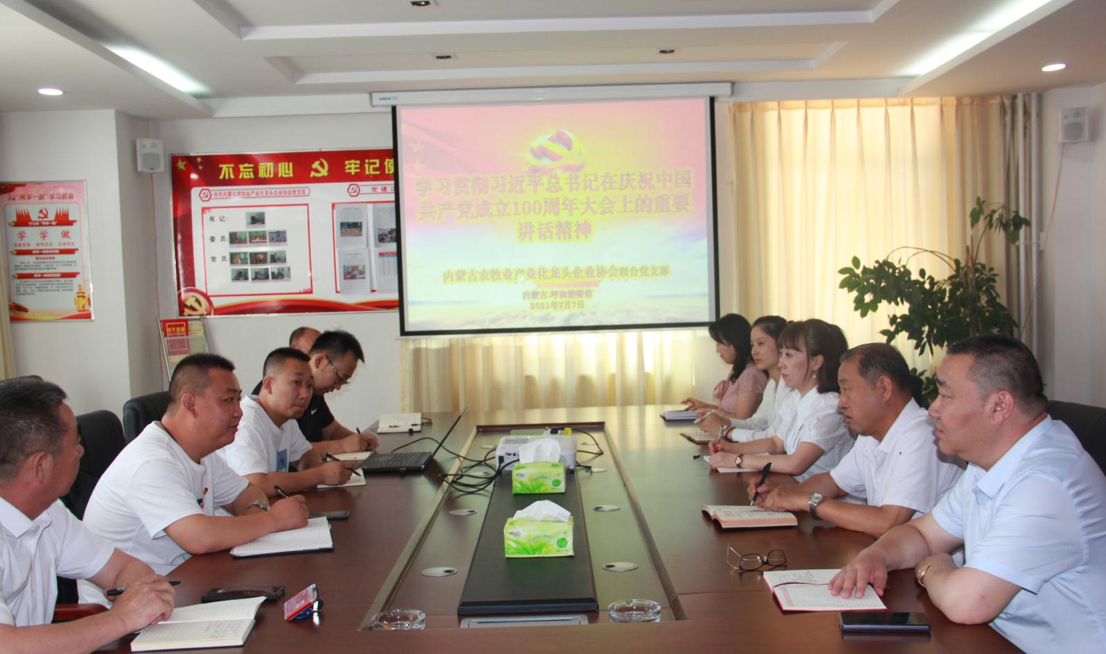 2021年7月7日上午,內蒙古農牧業(yè)產(chǎn)業(yè)化龍頭企業(yè)協(xié)會(huì )聯(lián)合黨支部書(shū)記李陽(yáng)主持召開(kāi)“學(xué)習貫徹習近平總書(shū)記在慶祝中國共產(chǎn)黨成立100周年大會(huì )上的重要講話(huà)精神”座談會(huì )。協(xié)會(huì )會(huì )長(cháng)周勇,執行會(huì )長(cháng)林永亮,執行秘書(shū)長(cháng)呼群等所有在呼黨員干部參加會(huì )議。