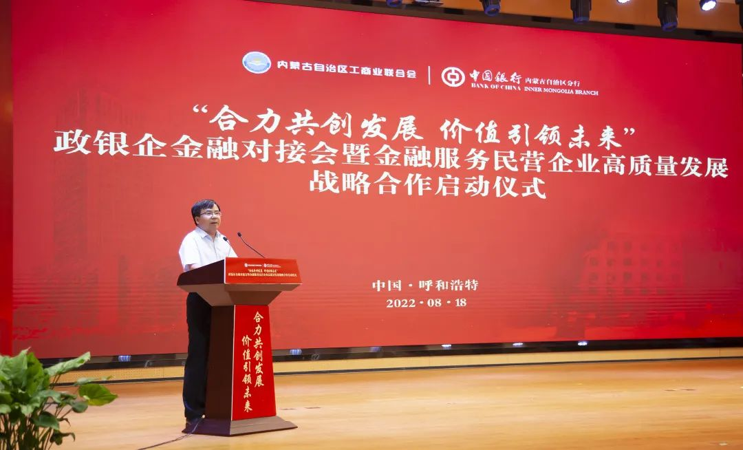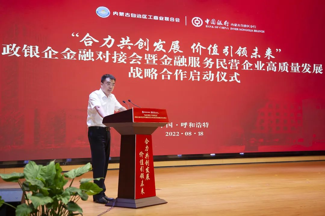 胡文勇行長(cháng)在開(kāi)場(chǎng)致辭中表示,一直以來(lái),自治區工商聯(lián)充分發(fā)揮統戰性、經(jīng)濟性、民間性綜合優(yōu)勢,團結和帶領(lǐng)廣大非公有制經(jīng)濟人士,與時(shí)俱進(jìn),大膽創(chuàng )新,努力實(shí)踐,推動(dòng)優(yōu)化營(yíng)商環(huán)境,促進(jìn)我區非公有制經(jīng)濟又好又快發(fā)展,為全面建設小康社會(huì )、構建和諧社會(huì )作出重要貢獻。作為唯一一家持續經(jīng)營(yíng)超過(guò)百年的國有大行,中國銀行秉承“融通世界、造福社會(huì )”的崇高使命,將自身發(fā)展與地方經(jīng)濟發(fā)展緊密相連,主動(dòng)擔當服務(wù)支持民營(yíng)企業(yè)發(fā)展壯大的金融重任。未來(lái),中國銀行內蒙古區分行將繼續深耕細作民營(yíng)經(jīng)濟領(lǐng)域的融資服務(wù),在普惠金融、科技金融、綠色金融等領(lǐng)域加強金融支持,緩解小微企業(yè)“融資難、融資貴”問(wèn)題,助企紓困,風(fēng)雨同舟,為深化政銀企合作共贏(yíng)發(fā)展貢獻新力量!