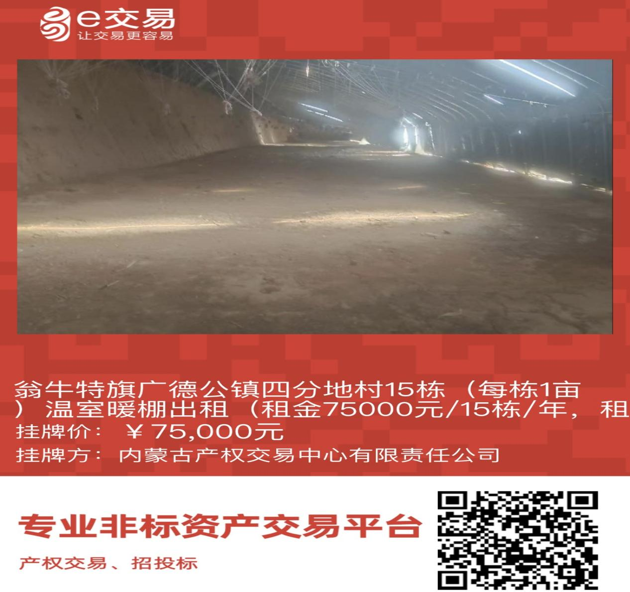 翁牛特旗廣德公鎮四分地村15棟(每棟1畝)溫室暖棚出租(租金75000元/15棟/年,租期1年)