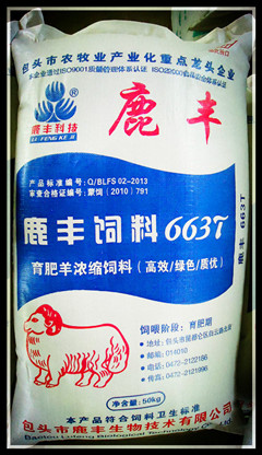 B、育肥羊濃縮飼料:執行標準Q/BLFS02-2013,主要原料組成:豆粕、菜粕、棉粕、DDGS、石粉、磷酸氫鈣、食鹽、復合預混料等。產(chǎn)品成分保證值:粗蛋白≧35.0,粗纖維≦14.0,粗灰分≦20.0,鈣1.8-4.0,總磷≧0.8,鹽1.0-2.0,水分≦14.0、賴(lài)氨酸≧0.8。