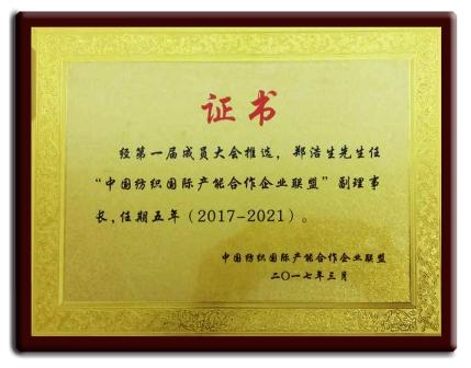 鄭浩生先生任2017-2021“中國紡織國際產(chǎn)能企業(yè)聯(lián)盟”副理事長(cháng)獎牌