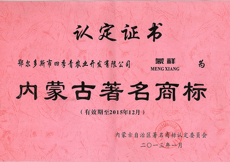 “蒙祥”牌羊肉榮獲內(nèi)蒙古自治區(qū)著名商標(biāo)