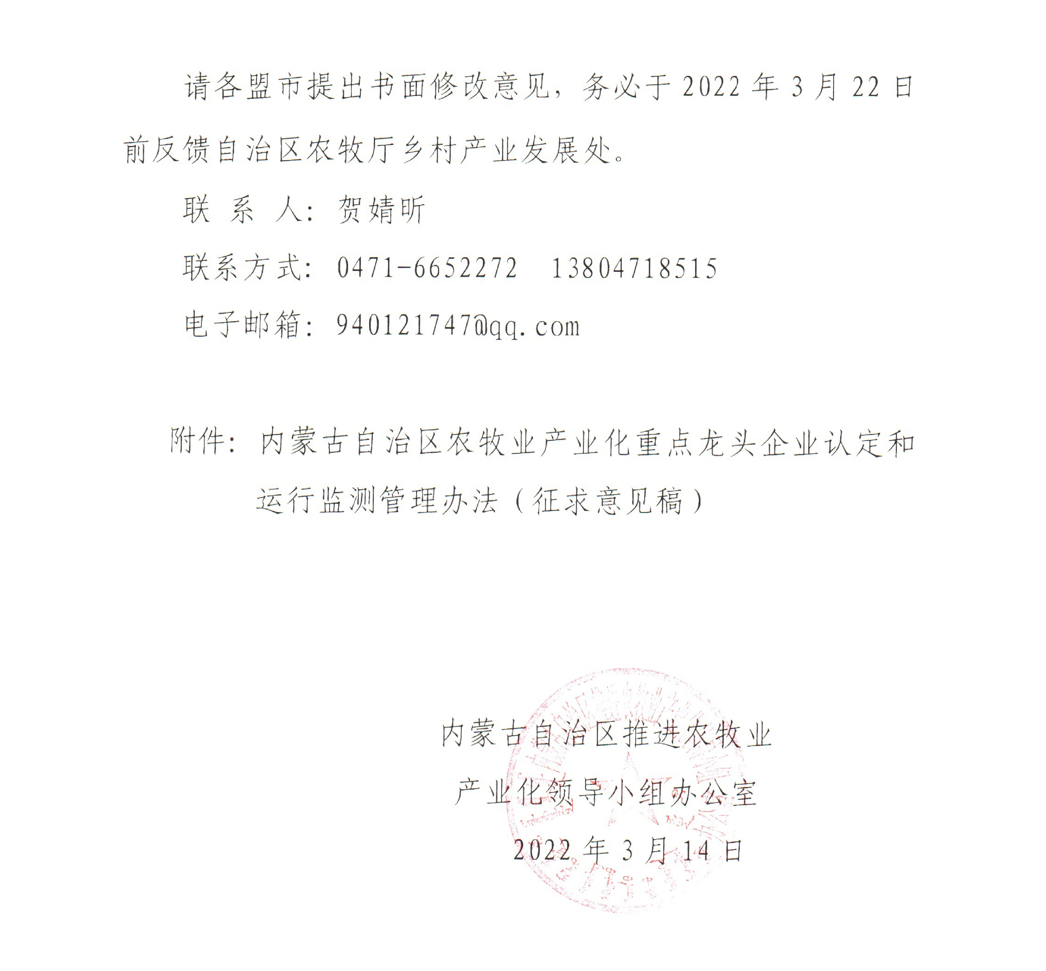 關(guān)于征求修訂《內(nèi)蒙古自治區(qū)農(nóng)牧業(yè)產(chǎn)業(yè)化重點龍頭企業(yè)認(rèn)定和運行監(jiān)測管理辦法(征求意見稿)》修改意見的函