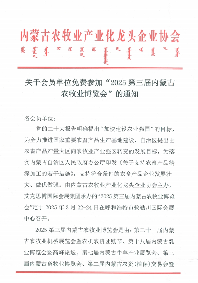 關(guān)于會(huì )員單位免費參加“2025第三屆內蒙古農牧業(yè)博覽會(huì )”的通知