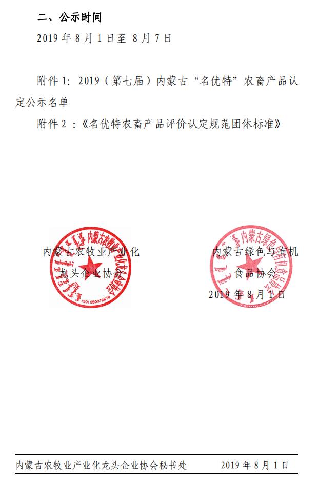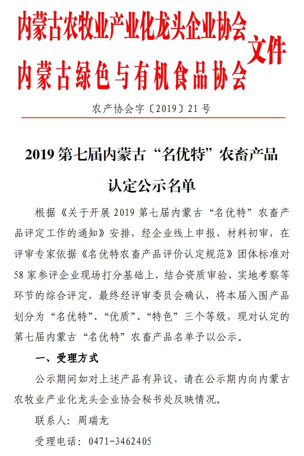2019年(第七屆)內蒙古“名優(yōu)特”農畜產(chǎn)品認定公示名單