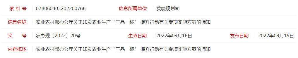 標題:農業(yè)農村部辦公廳關(guān)于印發(fā)農業(yè)生產(chǎn)“三品一標” 提升行動(dòng)有關(guān)專(zhuān)項實(shí)施方案的通知