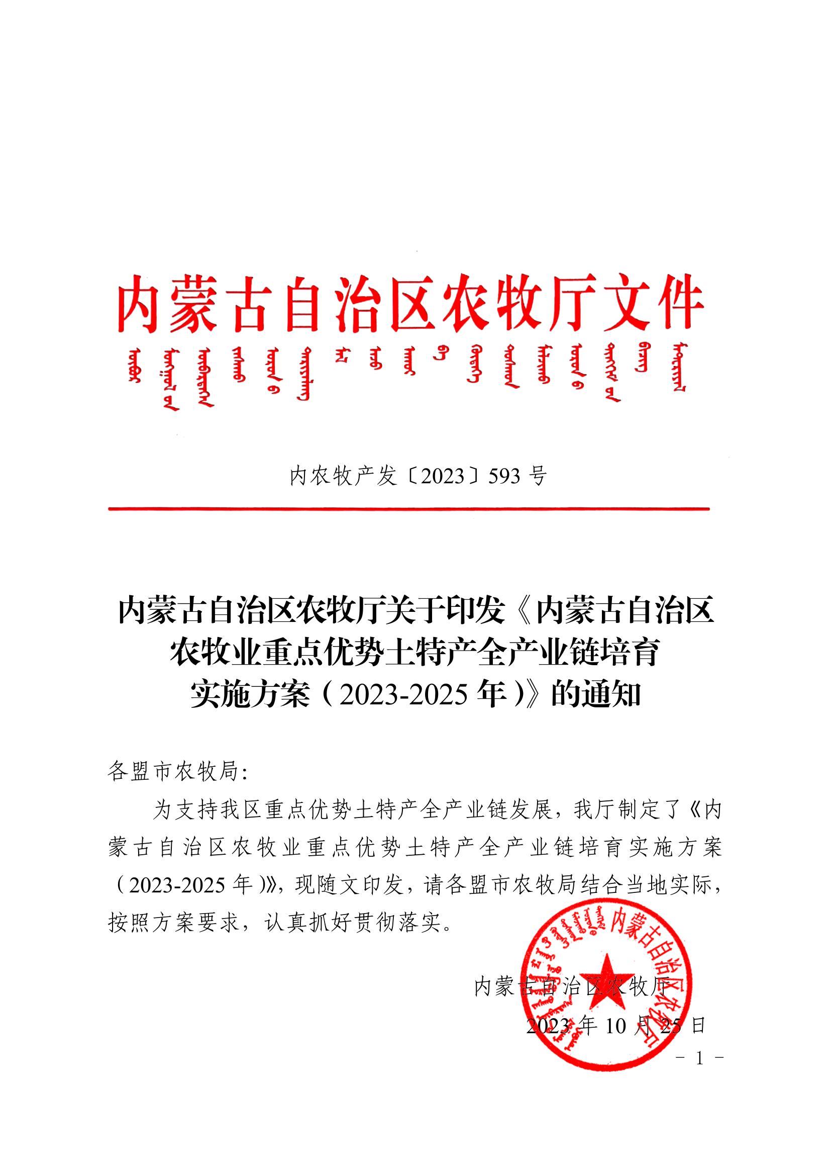 標題:內蒙古自治區農牧廳關(guān)于印發(fā)《內蒙古自治區 農牧業(yè)重點(diǎn)優(yōu)勢土特產(chǎn)全產(chǎn)業(yè)鏈培育 實(shí)施方案(2023-2025年)》的通知