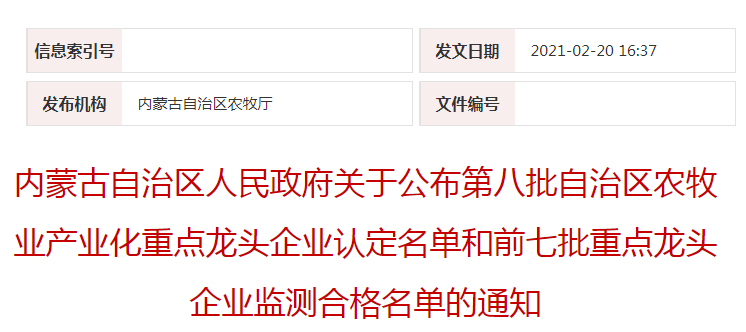 企業(yè)名稱(chēng):內蒙古自治區人民政府關(guān)于公布第八批自治區農牧業(yè)產(chǎn)業(yè)化重點(diǎn)龍頭企業(yè)認定名單和前七批重點(diǎn)龍頭企業(yè)監測合格名單的通知
