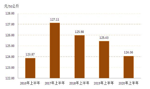1.小麥:1、2月份春節假期疊加新冠肺炎疫情,糧企停工停產(chǎn),市場(chǎng)交易趨于平淡,小麥收購價(jià)格整體穩定。3月份之后,隨著(zhù)新冠肺炎疫情得到有效控制,各地復工復產(chǎn)復學(xué)的大范圍推進(jìn),截止12月份全區小麥每50公斤平均收購價(jià)格為124.06元,同比下降1.09%,詳見(jiàn)圖3。(來(lái)源:內蒙古自治區發(fā)展和改革委員會(huì ))