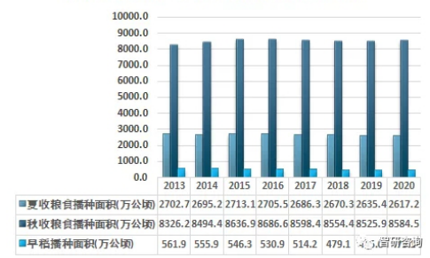 2020年全國糧食播種面積17.52億畝,比上年增加1056萬(wàn)畝,增長(cháng)0.6%;谷物播種面積14.69億畝,比上年增加176萬(wàn)畝,增長(cháng)0.1%;稻谷播種面積4.51億畝,比上年增加573萬(wàn)畝,增長(cháng)1.3%;豆類(lèi)播種面積1.74億畝,比上年增加778萬(wàn)畝,增長(cháng)4.7%。受大豆振興計劃政策帶動(dòng),大豆播種面積1.48億畝,比上年增加825萬(wàn)畝,增長(cháng)5.9%。中國糧食生產(chǎn)再獲豐收,產(chǎn)量連續6年保持在1.3萬(wàn)億斤以上,為扎實(shí)做好六穩工作、全面落實(shí)六保任務(wù),為應對復雜多變的國內外環(huán)境、克服各種風(fēng)險挑戰,為全面建成小康社會(huì )、打贏(yíng)脫貧攻堅戰提供了堅實(shí)的基礎。(數據來(lái)源:國家統計局、中商產(chǎn)業(yè)研究院整理)