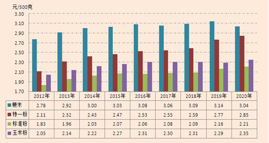 6   內蒙古自治區20122020年主要成品糧零售價(jià)格對比圖