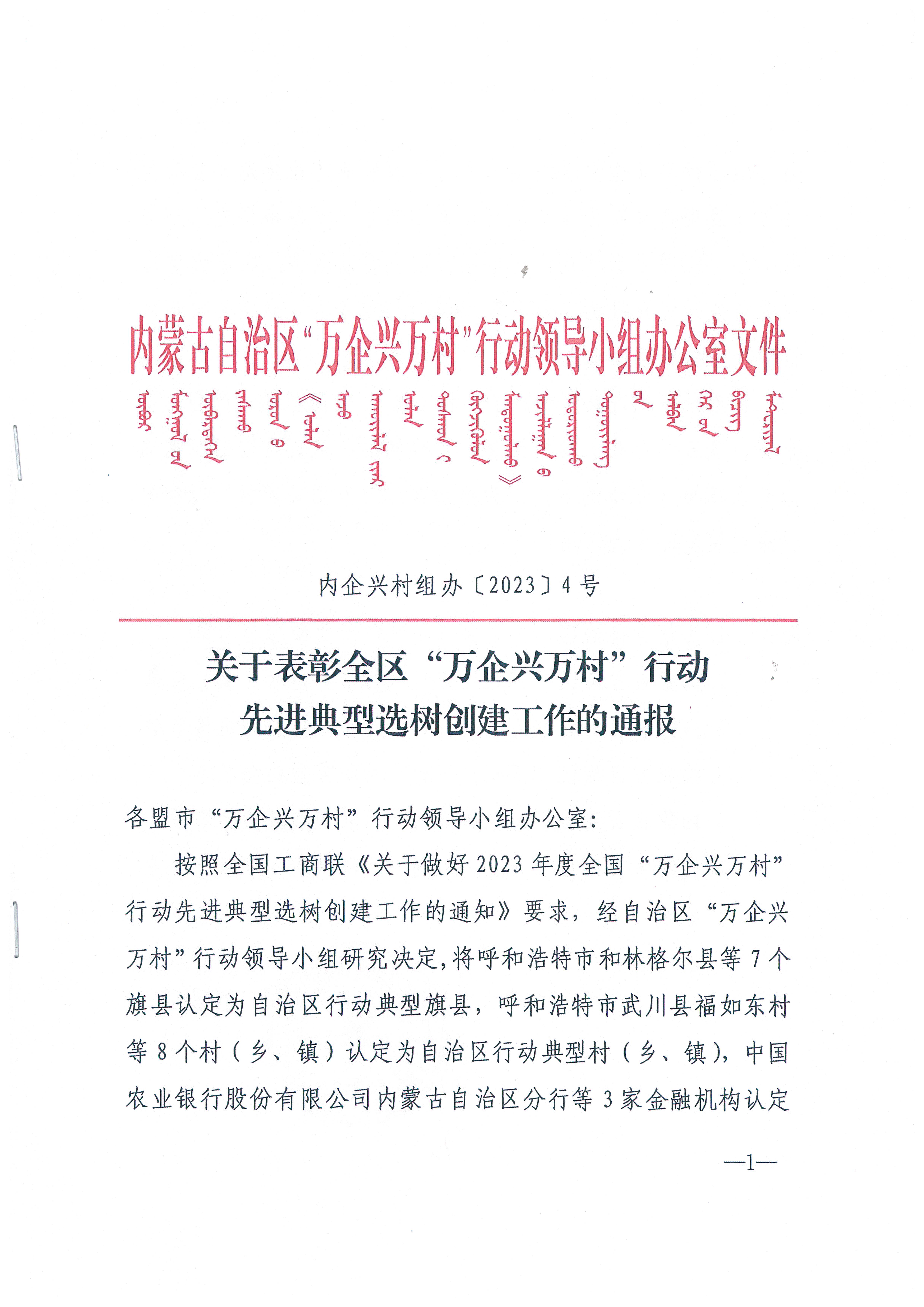 按照全國工商聯(lián)《關(guān)于做好 2023 年度全國“萬(wàn)企興萬(wàn)村行動(dòng)先進(jìn)典型選樹(shù)創(chuàng )建工作的通知》要求,經(jīng)自治區“萬(wàn)企興萬(wàn)村”行動(dòng)領(lǐng)導小組研究決定,將呼和浩特市和林格爾縣等 7個(gè)旗縣認定為自治區行動(dòng)典型旗縣,呼和浩特市武川縣福如東村等8個(gè)村(鄉、鎮)認定為自治區行動(dòng)典型村 (鄉、鎮),中國農業(yè)銀行股份有限公司內蒙古自治區分行等 3 家金融機構認定為自治區行動(dòng)典型金融機構,內蒙古農牧業(yè)產(chǎn)業(yè)化龍頭企業(yè)協(xié)會(huì )等 3 家商會(huì )認定為自治區行動(dòng)典型商會(huì ),鄂爾多斯光彩事業(yè)基金會(huì ) 1家基金會(huì )認定為自治區行動(dòng)典型基金會(huì ),內蒙古蒙清農業(yè)科技開(kāi)發(fā)有限責任公司等 19 個(gè)項目(企業(yè))認定為自治區行動(dòng)典型項目(企業(yè))。