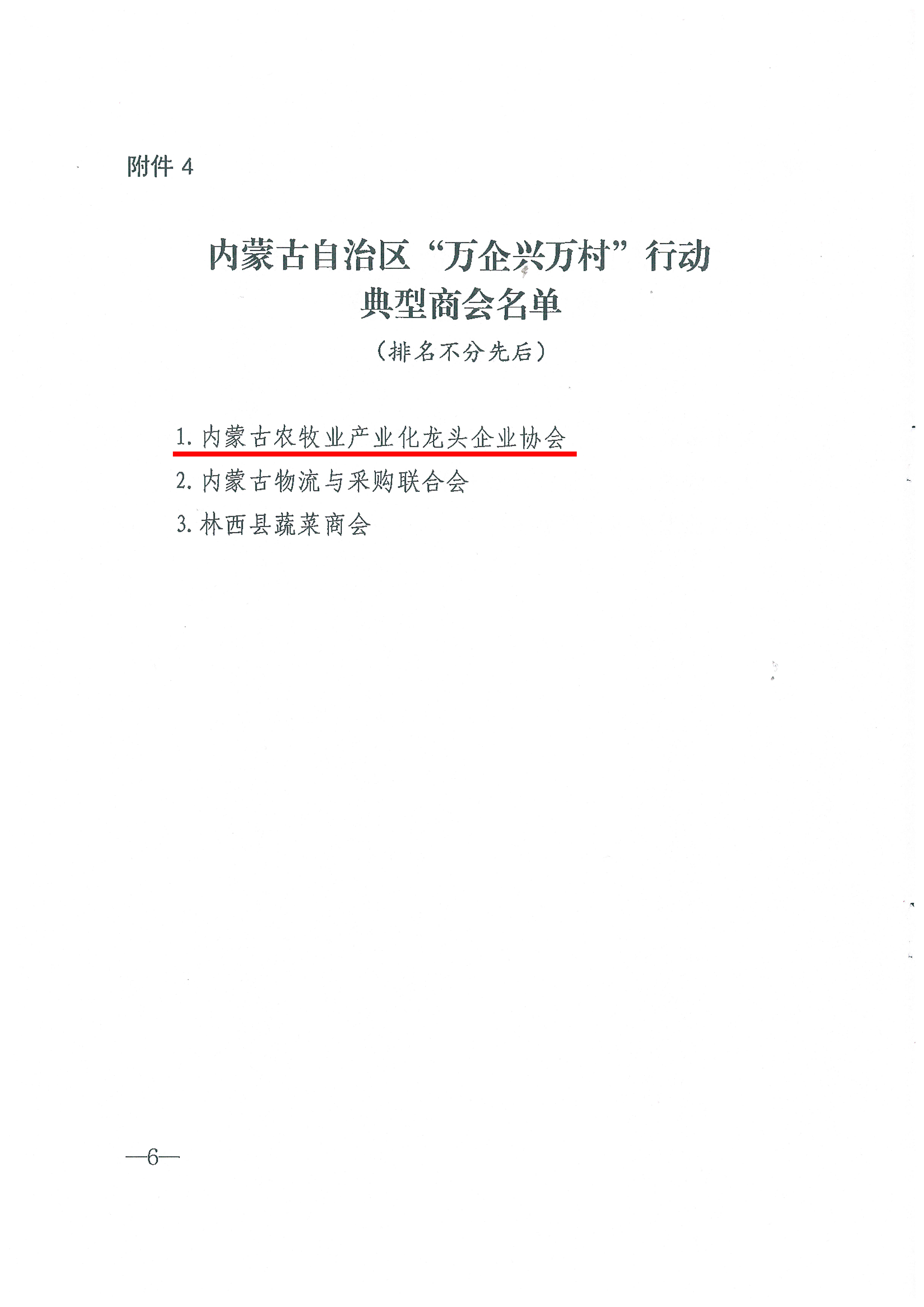標題:喜報!內蒙古農牧業(yè)產(chǎn)業(yè)化龍頭企業(yè)協(xié)會(huì )榮獲內蒙古自治區“萬(wàn)企興萬(wàn)村”行動(dòng)典型商會(huì )榮譽(yù)稱(chēng)號