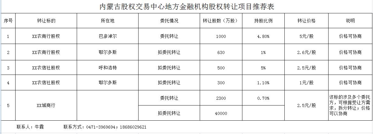 內蒙古股權交易中心地方金融機構股權轉讓項目推薦表