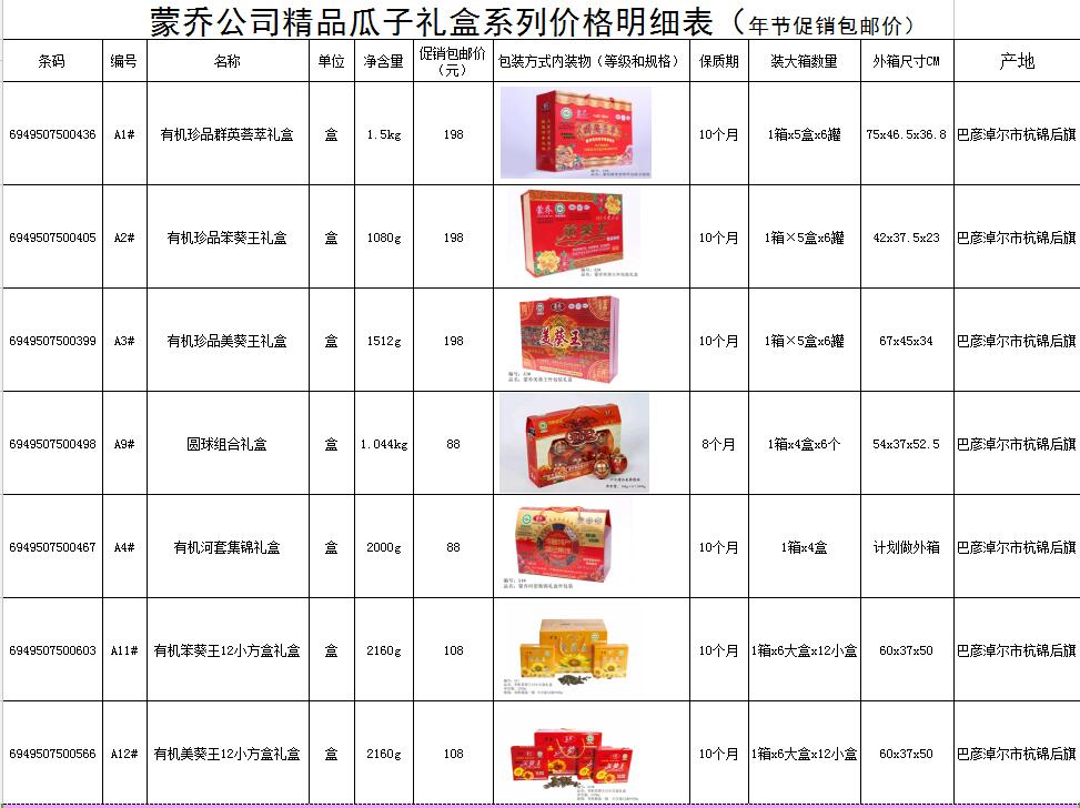 呼市鄂爾多斯大街石羊橋十字路西移動(dòng)大廳西20米北巷,現有大量年節禮品盒:巴盟有機葵花子禮盒低價(jià)促銷(xiāo)包郵,聯(lián)系電話(huà):15334782928,十盒包郵,價(jià)格如下: