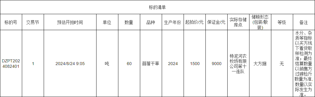 轉讓標的為苜蓿干草60噸,標的存放地位于特泥河農牧場(chǎng)有限公司第十一連隊,詳情見(jiàn)標的清單: