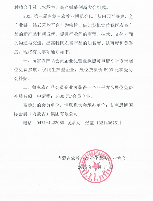 關(guān)于會(huì )員單位免費參加“2025第三屆內蒙古農牧業(yè)博覽會(huì )”的通知