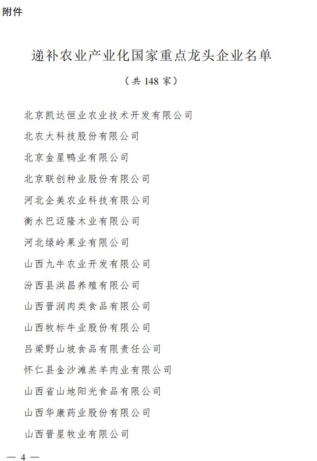 根據《農業(yè)產(chǎn)業(yè)化國家重點(diǎn)龍頭企業(yè)認定和運行監測管理辦法》(農經(jīng)發(fā)〔20181號)規定,對國家重點(diǎn)龍頭企業(yè)實(shí)行動(dòng)態(tài)管理,每?jì)赡赀M(jìn)行一次監測評估,做到有進(jìn)有出、等額遞補。2018年,全國農業(yè)產(chǎn)業(yè)化聯(lián)席會(huì )議八部門(mén)聯(lián)合開(kāi)展了第八次國家重點(diǎn)龍頭企業(yè)監測工作,各?。▍^、市)和新疆生產(chǎn)建設兵團按要求,嚴格規范、公平公正推薦遞補企業(yè),經(jīng)專(zhuān)家評審、聯(lián)席會(huì )議審定和媒體公示,決定遞補北京凱達恒業(yè)農業(yè)技術(shù)開(kāi)發(fā)有限公司等148家企業(yè)為農業(yè)產(chǎn)業(yè)化國家重點(diǎn)龍頭企業(yè)。