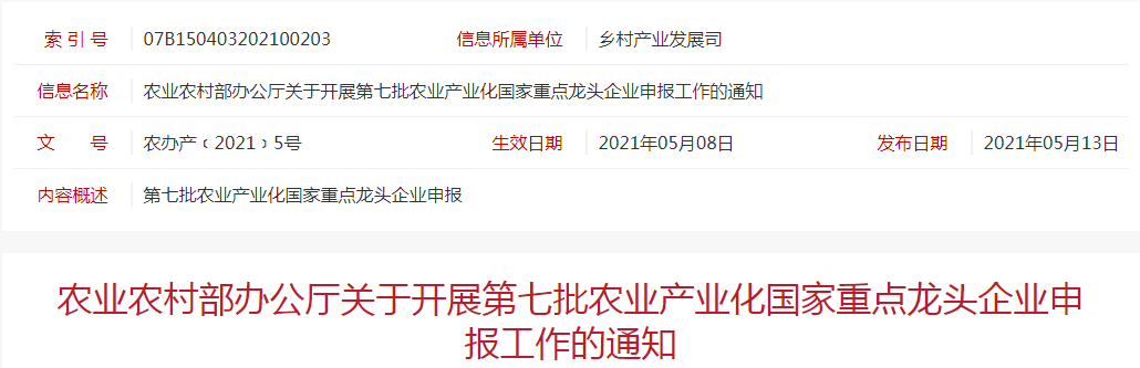 標題:農業(yè)農村部辦公廳關(guān)于開(kāi)展第七批農業(yè)產(chǎn)業(yè)化國家重點(diǎn)龍頭企業(yè)申報工作的通知