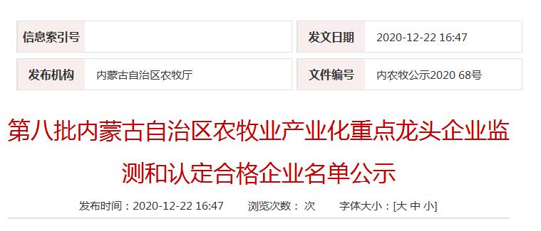 企業(yè)名稱(chēng):第八批內蒙古自治區農牧業(yè)產(chǎn)業(yè)化重點(diǎn)龍頭企業(yè)監測和認定合格企業(yè)名單公示