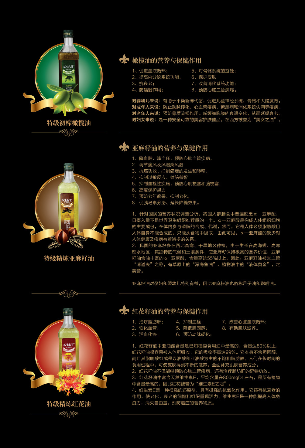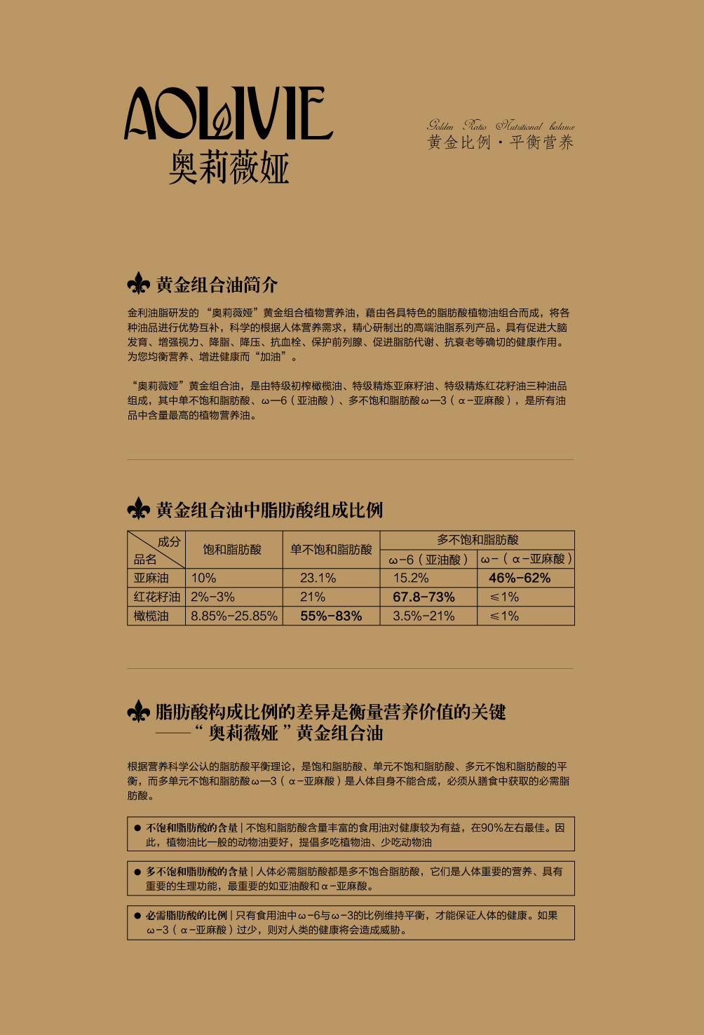 金利油脂(蘇州)有限公司研發(fā)的:“奧莉薇婭黃金組合植物營(yíng)養油,有各具特色的脂肪酸植物油組合而成,將各種油品進(jìn)行優(yōu)勢互補,科學(xué)的根據人體營(yíng)養需求,精心研制出的高端油脂系列產(chǎn)品。具有促進(jìn)大腦發(fā)育/增強視力/降脂/降血壓/抗血栓/保護前列腺/促進(jìn)脂肪代謝/抗衰老等良好的保健作用。為您均衡營(yíng)養/增強體質(zhì)而“加油”?!皧W莉薇婭黃金組合油,是有特級初榨橄欖油/特級冷榨亞麻籽油/特級精煉紅花籽油三種油品組成,其中單不飽和脂肪酸/α—亞麻酸和亞油酸,是所有植物油中含量最高植物營(yíng)養油。