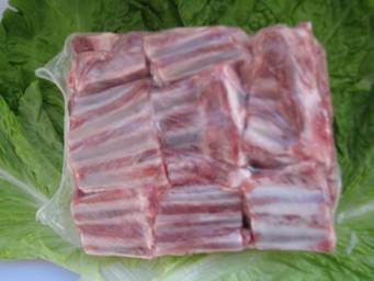 用羔羊肉排作原料,將羊排兩端鋸齊后順兩根肋骨中間方向平行下鋸,鋸成長(cháng)寬尺寸為4cm*4cm的正方形。鋸骨完成后去除表面骨渣和肉沫。