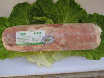 剔骨羔羊胴體羊肉(必須有后腿肉)常規修肉、去三角線(xiàn)硬皮部分、去掉全部背筋,順紋擺放,瘦肉朝外卷,肥瘦搭配均勻,部分碎肉(小于10%),肉塊順向碼放。