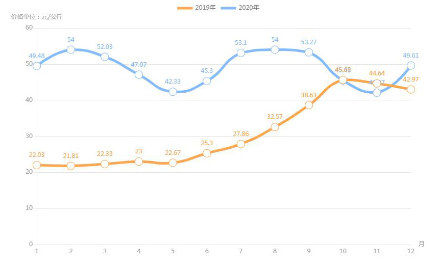 (一)內蒙古各大農貿批發(fā)市場(chǎng)2019年和2020年豬肉銷(xiāo)售價(jià)格走勢如下圖: